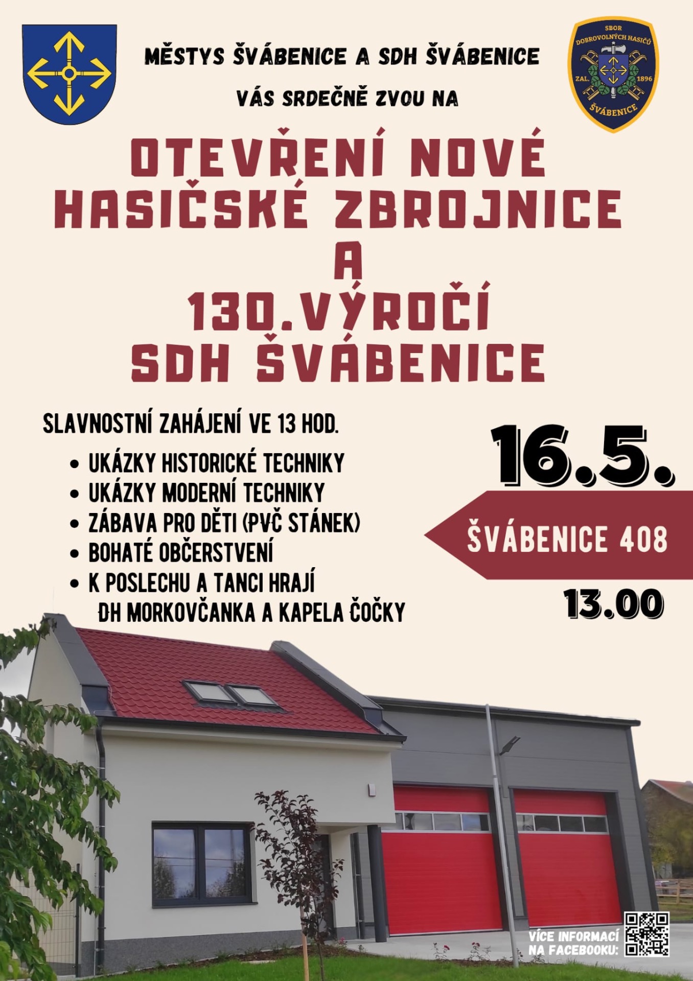 Srdečně vás zveme na slavnostní otevření nové hasičské zbrojnice a oslavy 130 let od založení Sboru dobrovolných hasičů Švábenice. Přijďte s námi prožít den plný tradic, ukázek hasičské techniky a setkání s lidmi, kteří se dlouhodobě starají o bezpečí naší obce. Připravujeme program pro děti i dospělé, prohlídku nové zbrojnice, historickou techniku, občerstvení a večerní posezení. Přijďte podpořit naše hasiče a společně oslavit významné jubileum SDH Švábenice.